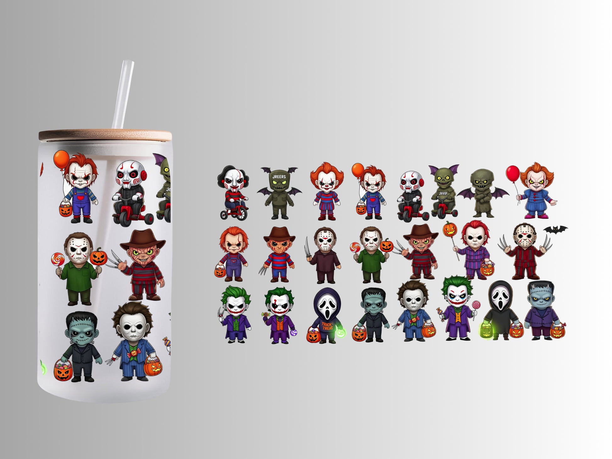 Bring spooky fun to your sips with this Cute Horror Characters Frosted Glass Can Cup! Featuring chibi-style versions of all your favorite horror icons—Chucky, Jason, Freddy Krueger, Michael Myers, Pennywise, Ghostface, Frankenstein, Joker, Jigsaw, and more—this cup is perfect for fans who love a mix of creepy and cute.