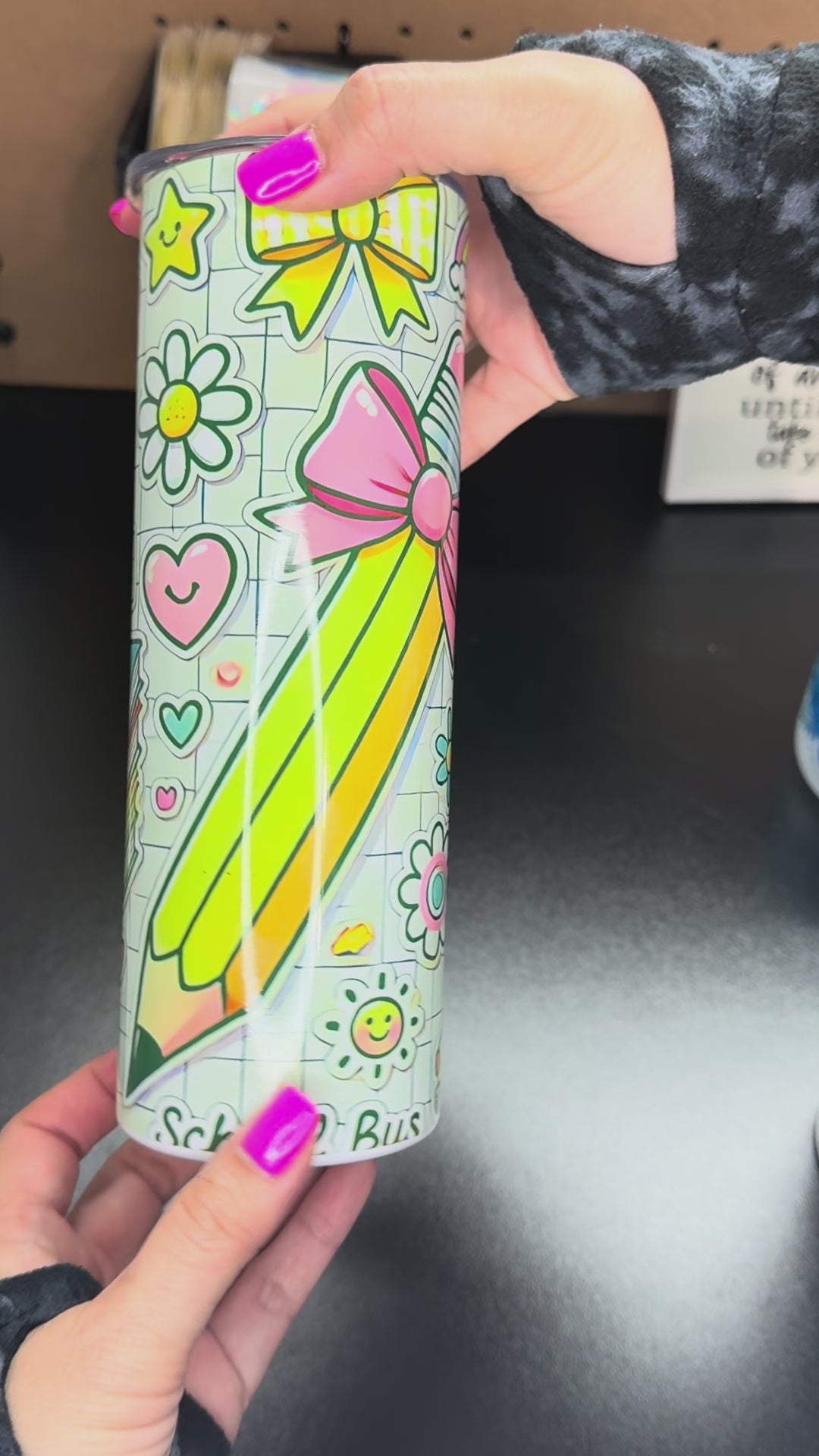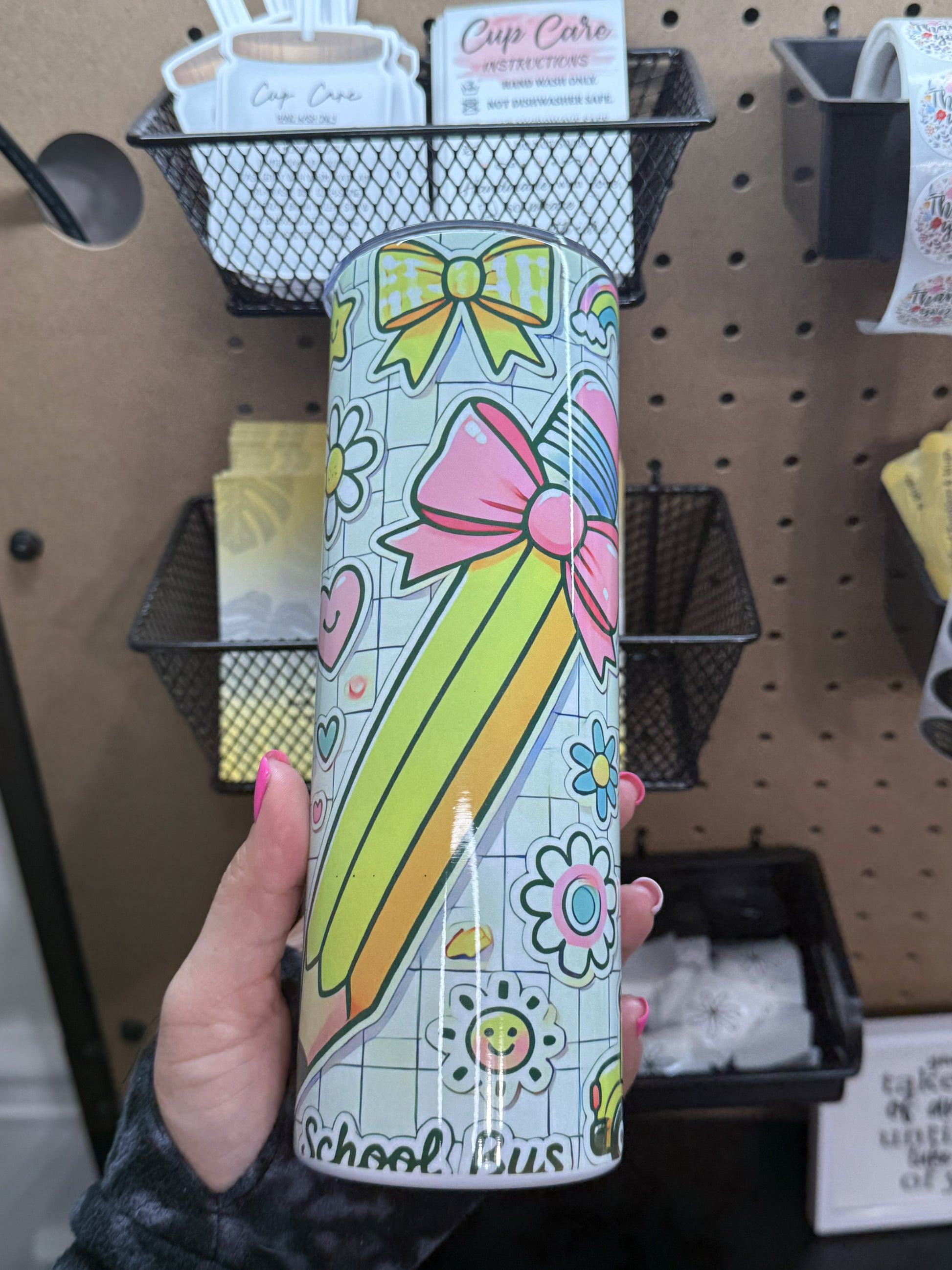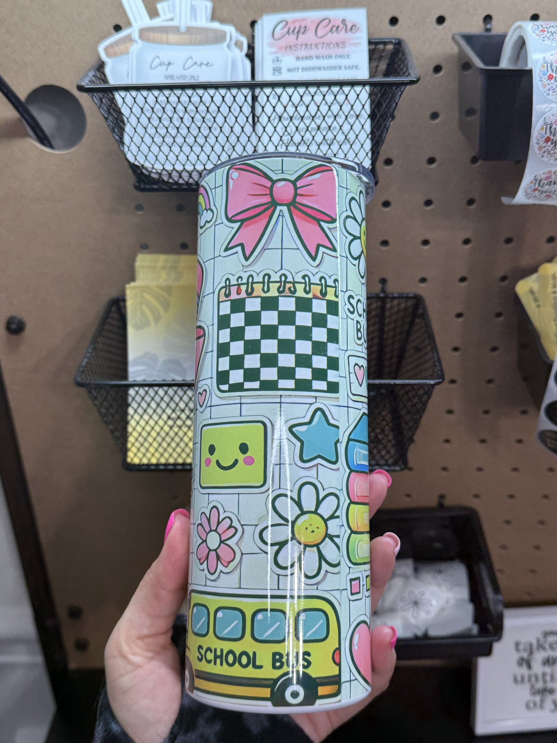 ✏️ Back to school never looked this cute! Whether you're a teacher, a student, or just obsessed with everything stationery-aesthetic, this Back to School Sublimation Skinny Tumbler is the must-have accessory for the new school year. Featuring an all-over wrap design bursting with retro-chic stickers — think coquette bows, cheerful daisies, stacked books, a classic yellow school bus, and a giant pencil — this tumbler is equal parts functional and adorable.