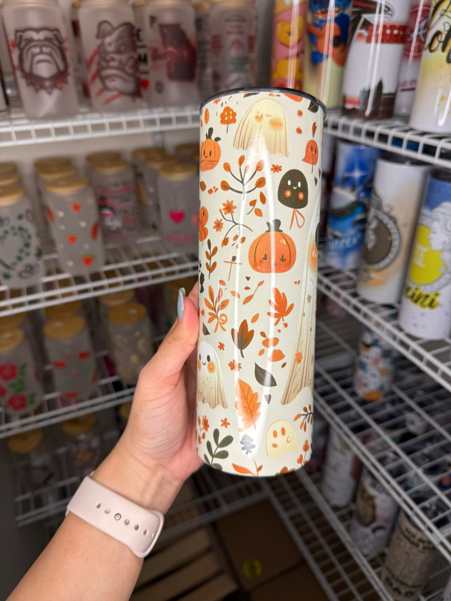 Get into the spooky season spirit with our Spooky Cute Fall Ghost Tumbler! This 20oz stainless steel tumbler features an enchanting pattern of smiling ghosts, pumpkins, and fall foliage—perfect for Halloween lovers and autumn vibes all season long.