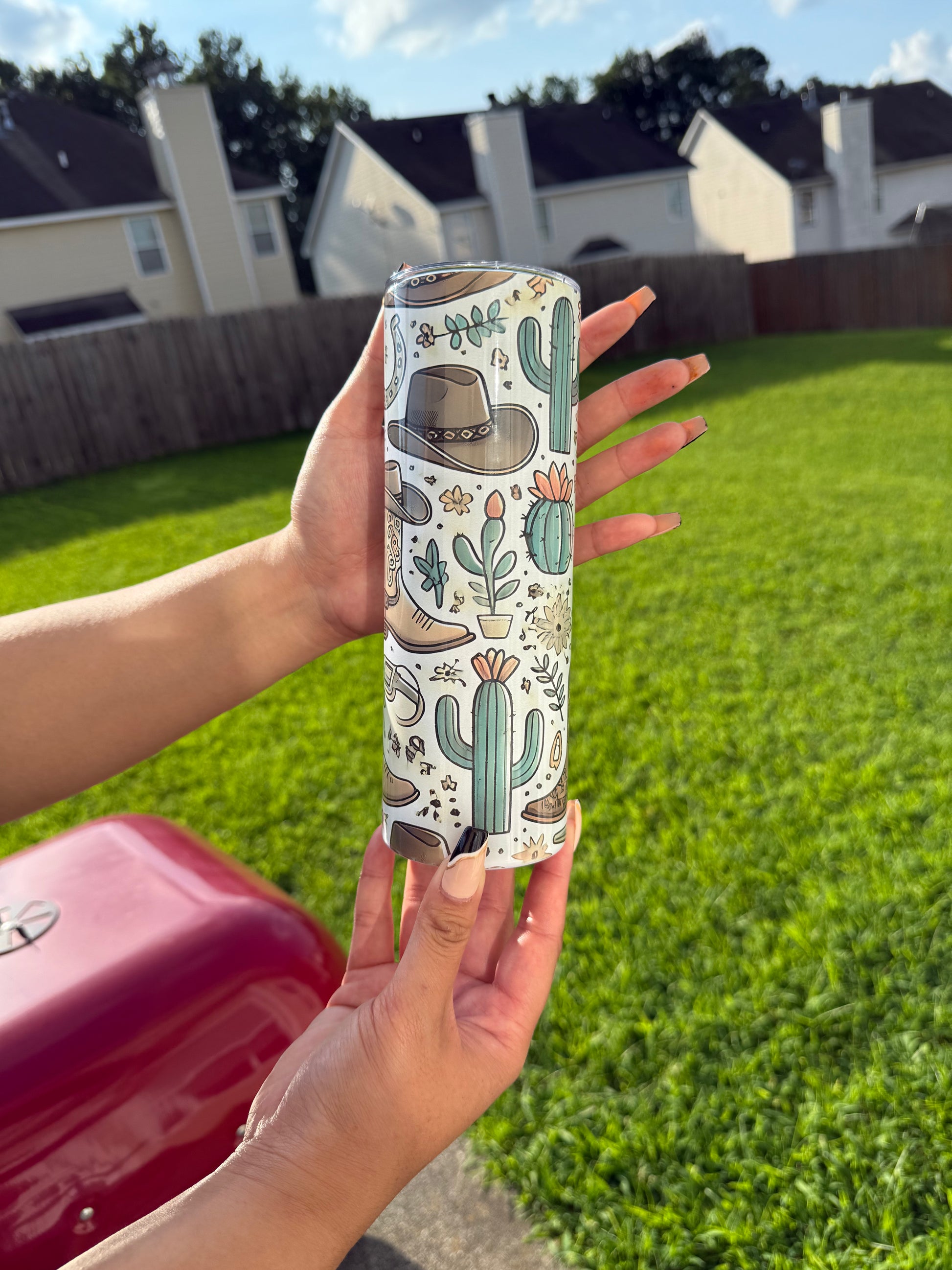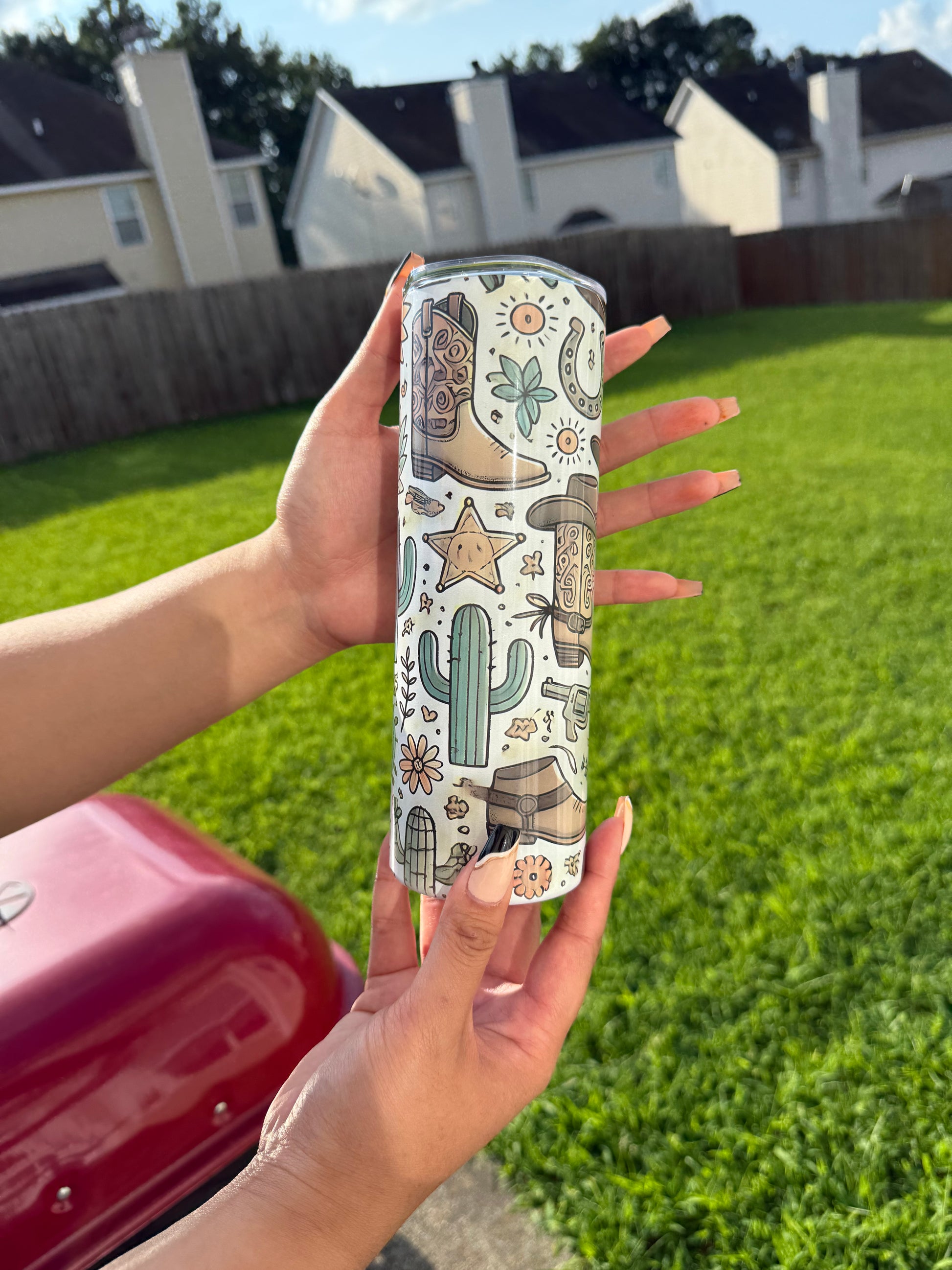 Western Cowboy Slim Tumbler – 20oz Insulated Stainless Steel Cup with Cactus & Boot